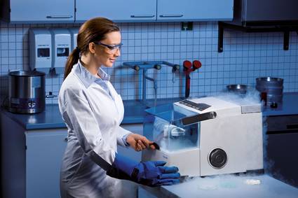 クライオミルは、凍結粉砕用に開発されたボールミルです。自加圧型液体窒素容器とボールミルを一体化した冷却構造で、予備凍結から粉砕までの全工程を通して粉砕ジャーが冷却されます。そのため、脆化された試料が容易に粉砕され、また、試料中の揮発性成分を保持することもできます。